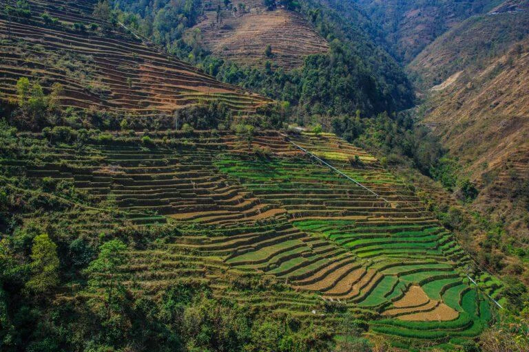 Jock (ein schottischer Velofahrer, den ich in Kathmandu getroffen hatte) empfahl mir von Kathmandu aus die Strasse über Daman nach Hetauda zu nehmen. Dies war ein guter Einstieg in die Berge. Fast auf jedem Stück Land wird hier Ackerbau im grossen Stil betrieben. Teilweise sehen die terrassierten Felder aus als hätte jemand ein Relief in die Landschaft gezeichnet.