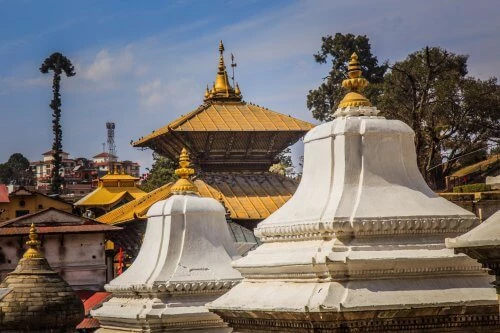 Der Pashupatinath-Tempel ist ein berühmter Hindu-Tempel aus dem 5. Jahrhundert, der Lord Shiva (Pashupati) gewidmet ist. Der Pashupatinath-Tempel am Ufer des Bagmati-Flusses im östlichen Teil von Kathmandu ist der älteste Hindu-Tempel in Kathmandu. Ein bedeutender Teil des Tempels wurde im 14. Jahrhundert von Mogul-Invasoren zerstört und befindet sich in der ursprünglichen Tempelfassade aus dem 5. Jahrhundert. Der heutige Tempel wurde im 19. Jahrhundert erbaut. Gläubige in Pashupatinath (meist Hindu) sind die einzigen, die den Bagmati-Fluss benutzen. Das Begräbnis mit der Ritualwäsche im Fluss und der Leiche auf einem Holzstapel.