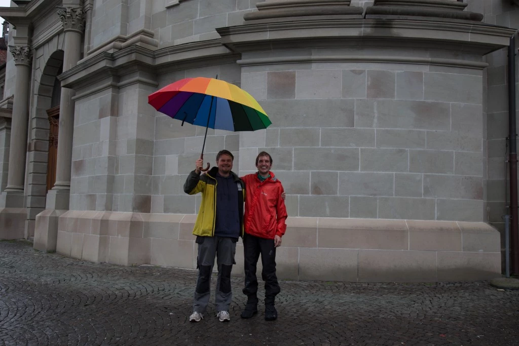 Diesmal gab mir der Regen neue Kraft, um meinen ersten grossen Aufstieg vom Zürichsee zum Kloster in Einsiedeln hinauf zu radeln, wo mein Kollege Claudius auf mich wartete. Wir besuchten die Kirche und er erfand mich im Restaurant für eine heiße Pizza. Einfache Dinge können Radfahrer sehr glücklich machen! Claudius fuhr mit dem Rad zurück nach Hause und ich genoss die lange Abfahrt nach Richterswil, wo Rahel und Sebastian auf mich warteten.
