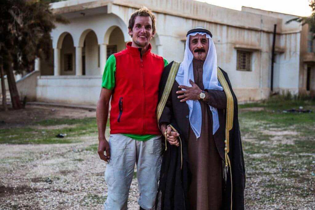 Bei der Ankunft in Al Husayniyah zeigte mir meine Karte, dass jetzt lange Zeit nur noch Wüste folgen wird. So fragte ich spontan beim ersten grossen Haus, ob es hier einen Platz für mein Zelt hat. Auch diesmal bekam ich gleich einen Raum zum schlafen. Der Gastgeber und sein ältester Sohn luden mich gleich zum Mänsäf essen ein. Das traditionelle Essen der Beduinen. Sein Vater arbeitete anscheinend eng mit dem König von Jordanien (Abdullah II. bin al-Hussein) zusammen und dessen Vater soll angeblich schon im gleichen Raum wie ich übernachtet haben. Nicht schlecht!