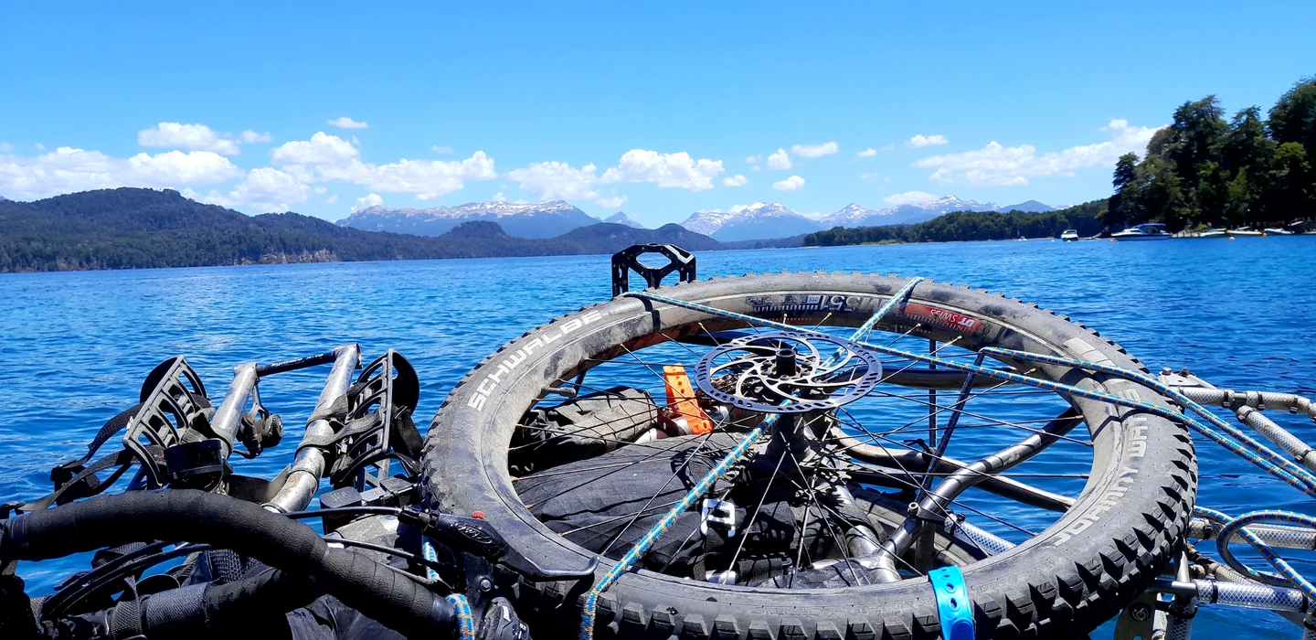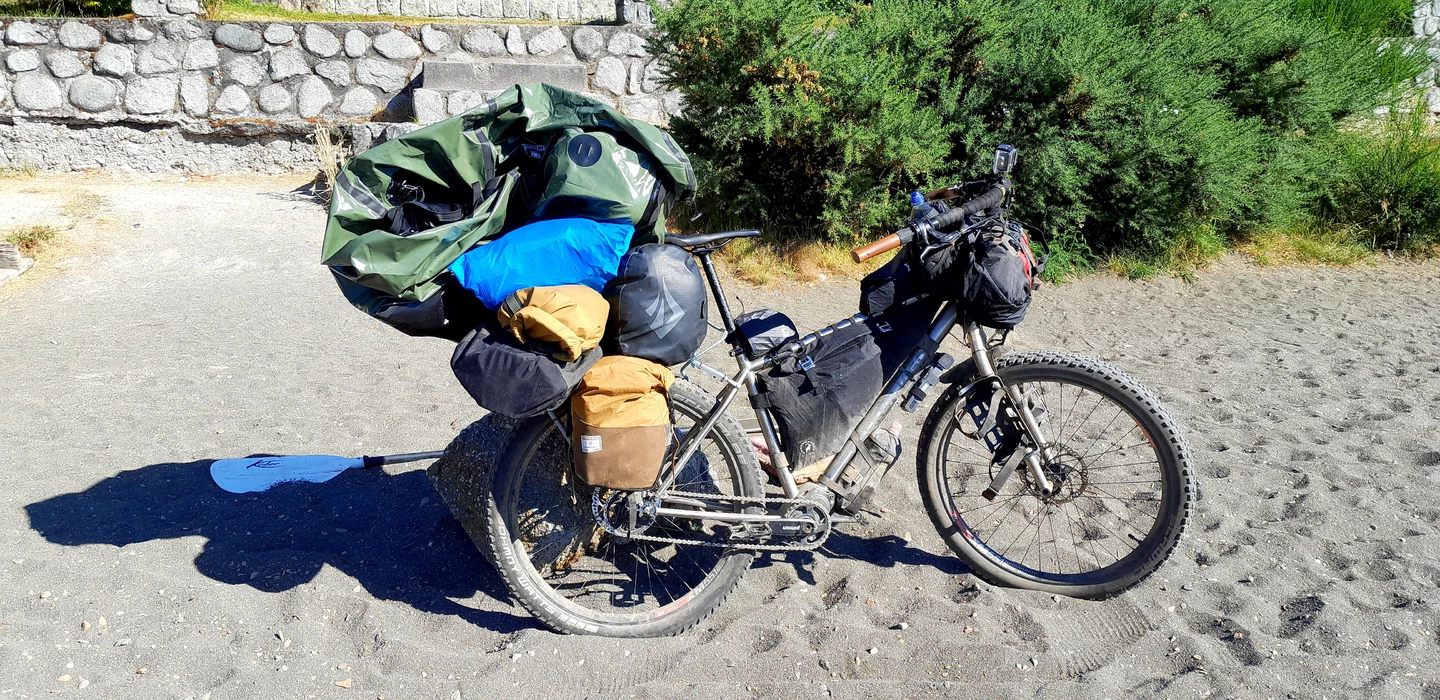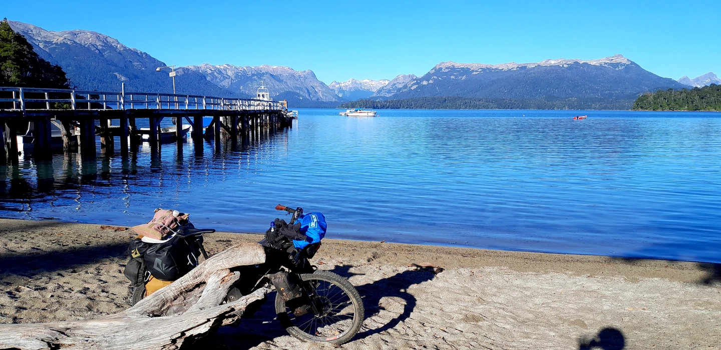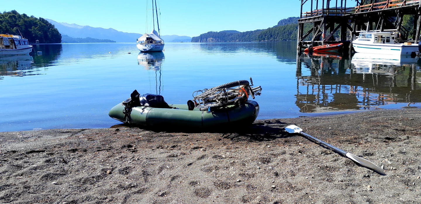 Am Strand von Villa La Angostura fing ich an mein Packraft zu beladen. Dazu musste ich zuerst sämtliche Taschen von meinem Velo runter nehmen.