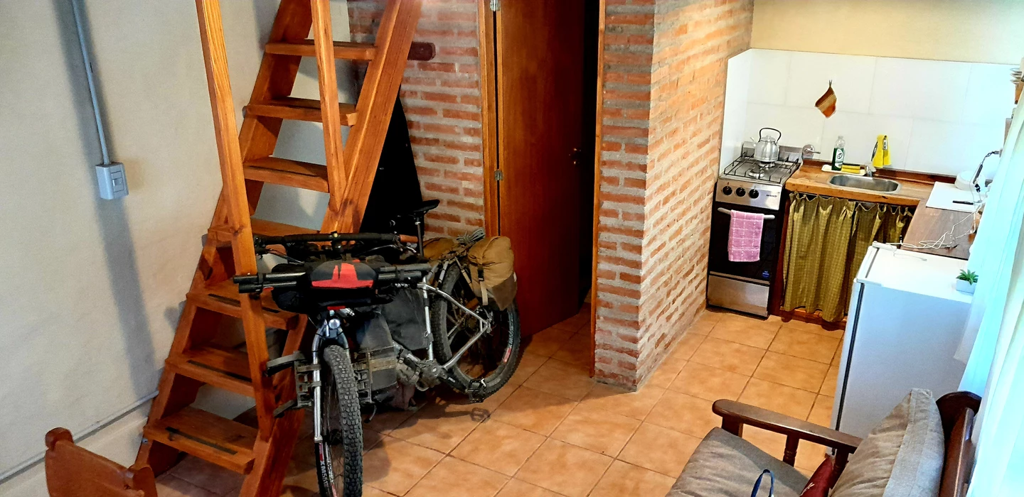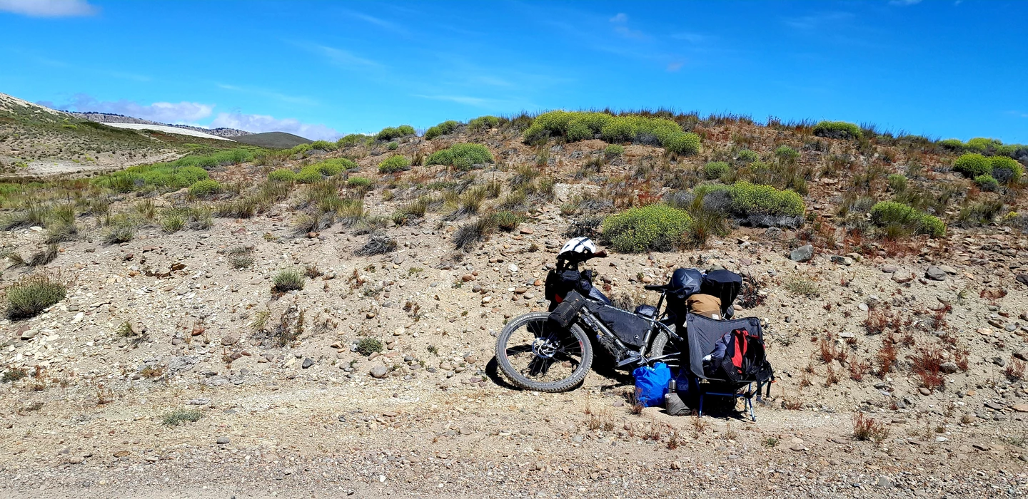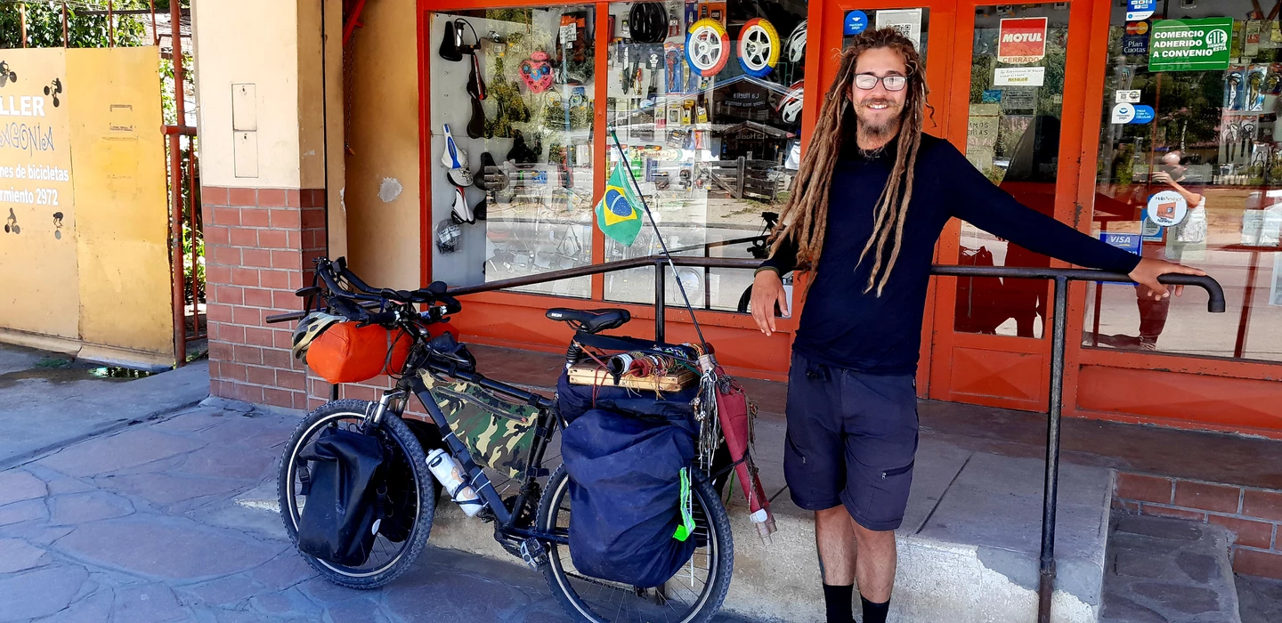 Er ist von Süden her auf der Ruta 40 hochgeradelt. Dabei ist ihm die Nabe am Vorderrad gebrochen. Sein Ziel ist es bis nach Mexiko zu radeln.