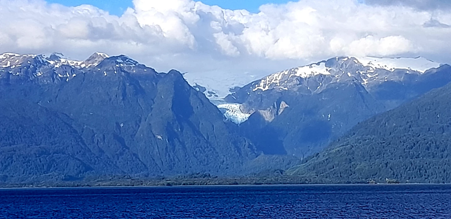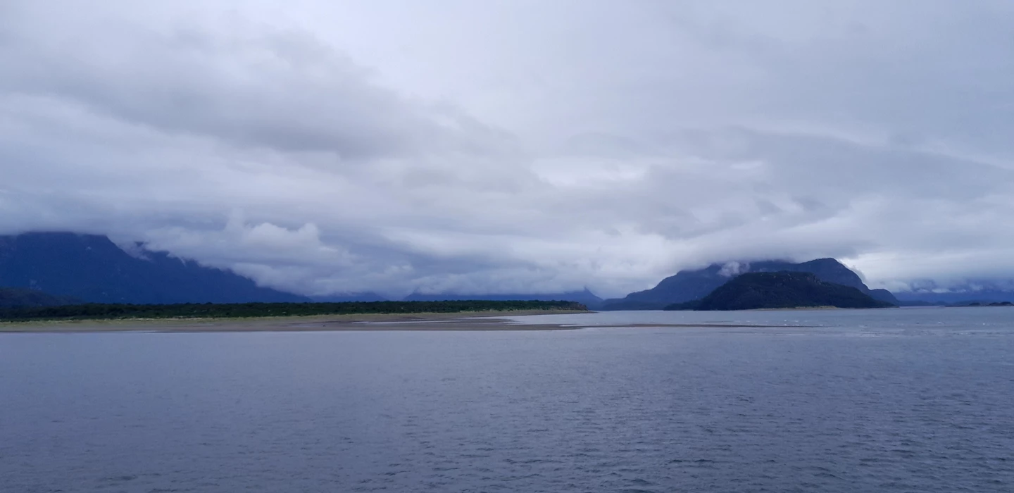Einer der schönsten Abschnitte kam kurz vor der Einfahrt zu Puerto Cisnes. Auf einmal tauchte hinter den Inseln zuerst der Nationalpark Queulat auf.
