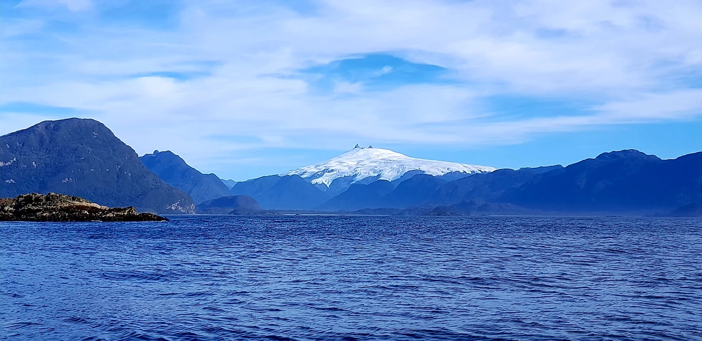 Zwischen den Inseln konnten wir dank dem schönen Wetter auch wunderbar den Vulkan Melimoyu erblicken. Sein riesiger Gletscher ist ziemlich imposant und das noch viel grössere (gleich angrenzende) Reserva Natural Melimoyu ist nach ihm benannt.