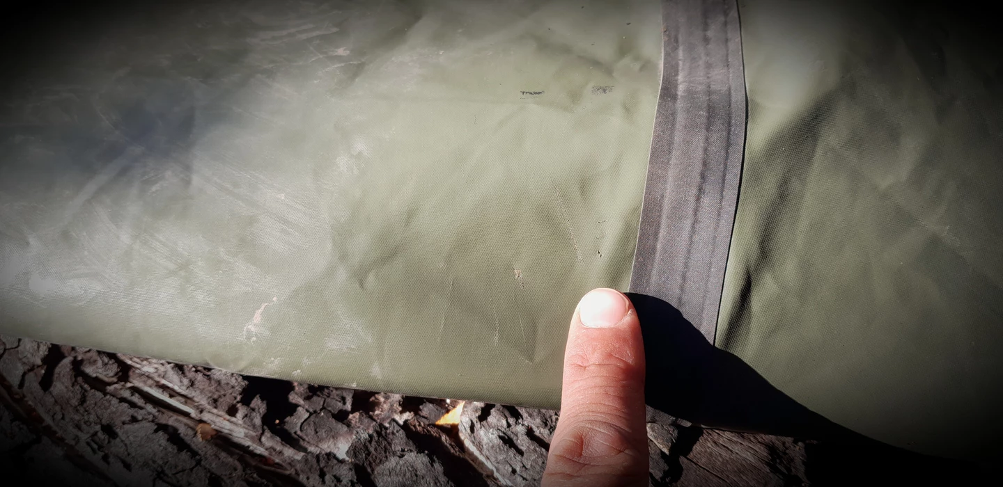 Während Rhys ein leckeres Abendessen kochte, reparierte ich mein Packraft mit Ducktape. Zuerst von der inneren Seite.