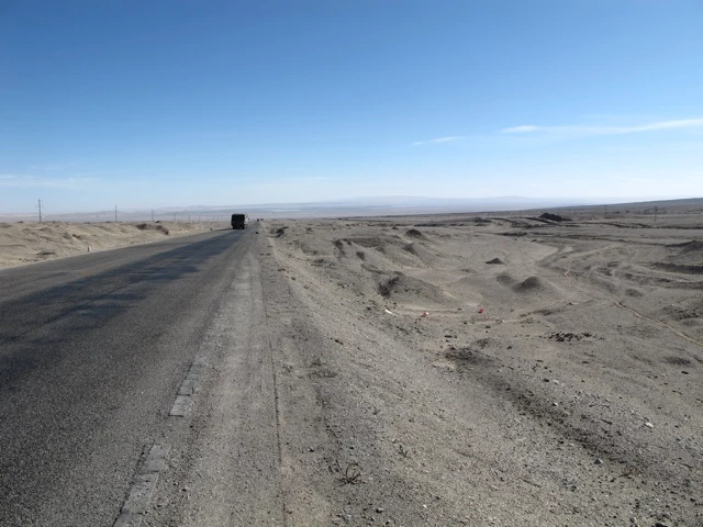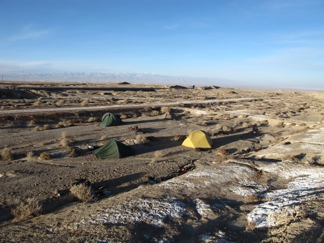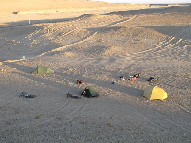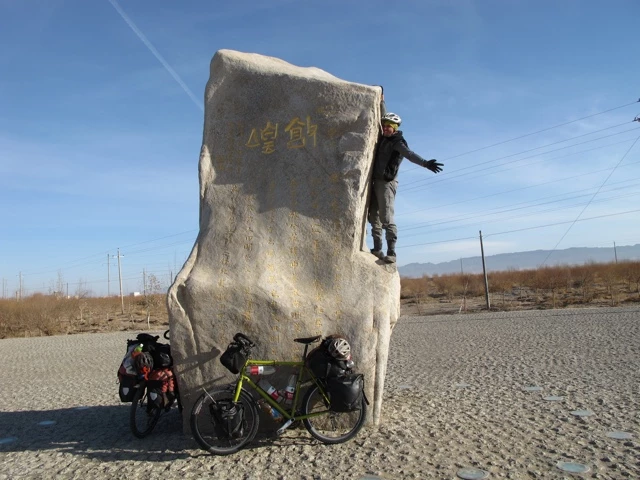 Schon nach kurzer Zeit hatte ich einen Entschluss gefasst: bei dieser Kälte wollte ich die Nacht nicht im Freien verbringen. Jiayuguan, die nächstgelegene Ortschaft, lag 120 Kilometer entfernt. Mit ein bisschen Glück könnte ich es schaffen. Jedoch merkte ich bald, dass zehn Tage Pause, schlechte Strassenverhältnisse und starker Gegenwind nicht gerade optimale Indikatoren sind um eine solche Tat zu vollbringen. Als um 18:00 Uhr die Sonne langsam unterging war ich noch knapp 20 Kilometer von Jiayuguan entfernt. Ich sass bereits über 8 Stunden im Sattel und hatte, ausser ein paar Snickers, noch nichts gegessen. Das Wasser war bereits schon 2 Stunden nach der Abfahrt komplett gefroren. Sogar in der Thermosflasche.