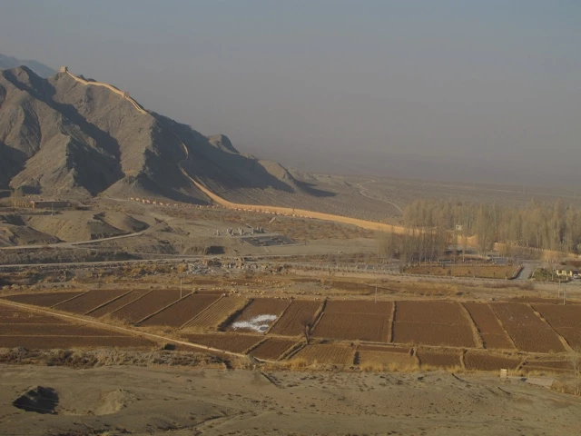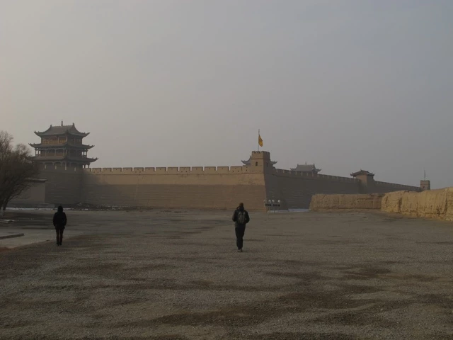 Die Jiayuguan- Festung überwacht den Pass, der zwischen den Gipfel des Qilian Shan und Hei Shan (Schwarze Berge) des Mazong- Shan- Gebirgszugs verläuft. Erbaut im Jahre 1372, erhielt das Fort den Namen “ Erste starke Festung unter dem Himmel“. Obwohl die Chinesen oft ein Territorium weit über die Gegend von Jiayuguan hinaus kontrollierten, war dies das letzte Bollwerk des imperialen Chinas- das Ende der „zivilisierten Welt“, jenseits davon gab es nur Wüstendämonen und die barbarischen Armeen Zentralasiens. Am östlichen Ende der Festung liegt das Tor der Erleuchtung (Guanghua Men) und im Westen das Tor der Versöhnung (Rouyuan Men), von wo aus ins Exil verbannte Dichter, Minister, Kriminelle und Soldaten ins Vergessen losrissen.