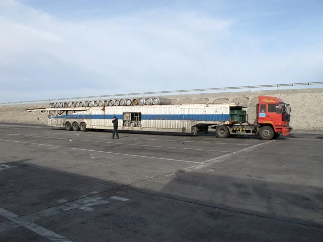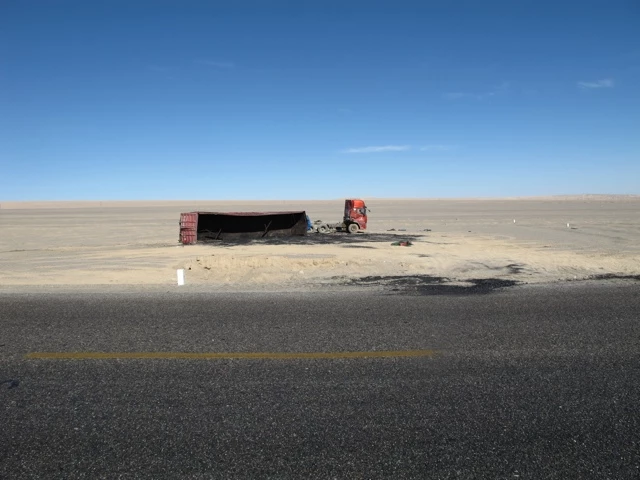 Unser Proviant ging erneut langsam zu Ende. Dafür war der Wind zum ersten Mal seit 2’000 Kilometern auf unserer Seite und blies uns an diesem Tag schön in den Rücken. So gelang uns ein neuer Tagesrekord von 120 Kilometer. Es war bereits am dämmern, als wir unsere Zelte aufstellten und Nudelsuppe kochten. Ohne Frühstück ging die Fahrt weiter am nächsten Tag. Nach 5 Kilometern tauchte zum Glück bereits die erste Tankstelle auf. Wir stillten unsere Bedürfnisse, spielten Yatzi und schauten den riesigen Lastwagen zu. Diese haben teilweise enorme Ausmaße.