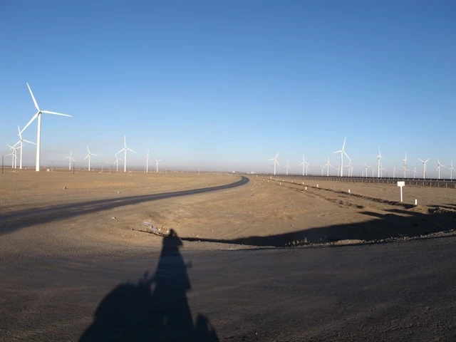 Pünktlich zum Sonnenaufgang fuhr ich gegen 9:00 Uhr los. Der Gegenwind war eisig kalt und schon nach wenigen Kilometern fror ich am ganzen Körper. Kein Wunder stehen rund um Yumenshe Windkraftwerke.