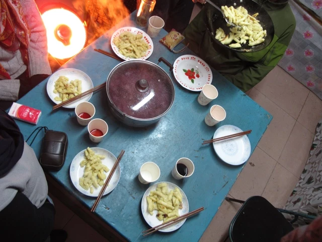In der Realität fühlt man sich in den Bauten wie in eine andere Zeit versetzt. Die chinesischen Touristen wollten ständig Bilder mit uns machen. So seltene Vögel sieht man schliesslich nicht jeden Tag. Nach einer Weile wurde uns ziemlich kalt. Im Souvenir Shop wärmten wir uns bei Käse und Brot auf. Nina und Jenny haben diese Raritäten von einem Lehrerkollegen aus der Inneren Mongolei bekommen. Wenn man seit Monaten keinen richtigen Käse mehr im Gaumen hatte, fühlt sich ein solcher Moment einfach megagigageil an. Die Angestellten brachten uns sogar noch Grüntee vorbei. Da Tim von nun an alleine weiter fährt und Jenny und Nina wieder am Montag unterrichten mussten, gingen wir nochmals ins Teehaus zum „Mo- shi“ (eine lokale Süssigkeit) essen und Tee schlürfen.