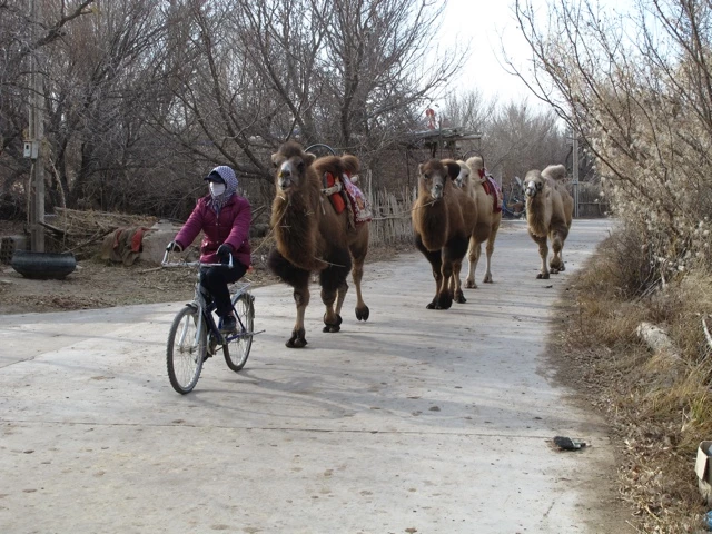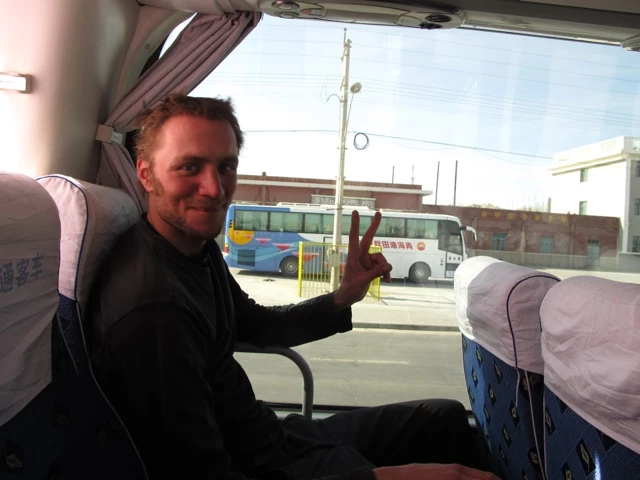 Am Abend ging es erneut zu unserem Nudelkönig. Dort schmiedeten wir einen Plan für den nächsten Tag: an der einzigen Tankstelle im Ort wollten wir versuchen einen Lastwagen zu finden, der uns bis nach Dunhuang mitnimmt. Die Angestellten an der Tankstelle waren äusserst freundlich und hilfsbereit. Nach zwei Stunden warten tauchte immer noch kein Fahrzeug auf. Uns wurde aber versichert, dass um 12:00 Uhr ein Bus nach Dunhuang fahren würde. Tatsächlich fanden wir nach intensiver Suche den Ticketschalter, zahlten drei Tickets extra für die Velos (390 Yuan Total) und sassen schon kurze Zeit später im geheizten Bus nach Dunhuang. Ein herrliches Gefühl!