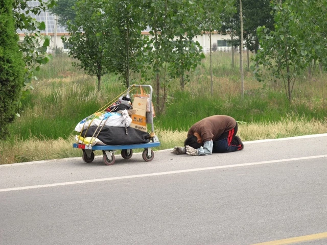 Auch buddhistische Pilger zogen regelmässig vorbei. Den gesamten persönlichen Besitz stossen sie auf kleinen Wagen vor sich her. An den Knien tragen sie teilweise riesige Polster, damit sie sich nach fast jedem Schritt auf den Boden knien können. Bereits im Iran hatte ich die dortigen muslimischen Pilger bewundert. Es ist immer wieder eindrücklich zu sehen, was ein Glaube in den Menschen bewirken kann.