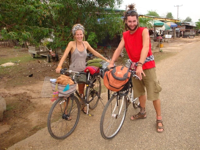 Nach dieser Notoperation konnte ich am nächsten Tag weiter Richtung Tha Khaek radeln. Bereits nach etwa 60 Kilometern Fahrt kamen mir Gaëtan und Solenne aus Frankreich entgegen. Sie arbeiten während den Wintermonaten jeweils in der Gastronomie und reisen im Sommer durch die Gegend. Diesmal haben sie sich in Bangkok spontan entschlossen zwei Velos zu kaufen und fahren damit bis Ende Mai durch Thailand und Laos. Ich wechselte meine restlichen Riels aus Kambodscha gegen ein Cola.