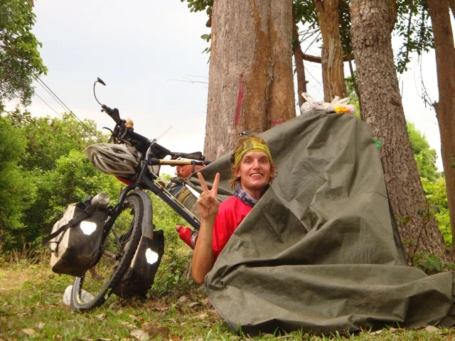 Nach diesem kurzen Boxen stop fuhr ich weiter. Am zweiten Tag erlebte ich zuerst einen wunderschönen Sonnenaufgang. Doch bereits gegen Mittag verdunkelte sich der Himmel und gerade als ich Siesta halten wollte, begann es zu regnen. Zum Glück konnte ich gerade noch meine Plane über mich werfen. Nach etwa einer Stunde beruhigte sich der Gewitterregen ganz kurz. Doch leider hielt er ziemlich lange an, sodass ich mich nach einem trockenen Platz für mein Zelt umschauen musste.