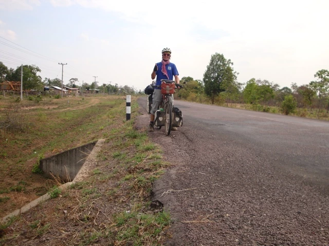 Bereits nach einem halben Tag radeln stand ich an der Grenze zu Laos. Am Zoll verlangten die Beamten auf beiden Seiten jeweils 2 Dollar Stempelgebühr. Zuerst überlegte ich mir, dies zu verweigern. In meinen Augen ist das Korruption. Doch die Beamten liessen nicht locker. Diesen Grenzübergang werde ich in Zukunft meiden. Auch wenn er der Einzige zwischen Laos und Kambodscha ist. Nach dem Grenzübertritt bemerkte ich an meinem Hinterrad, dass der Pneu einen Riss hatte.