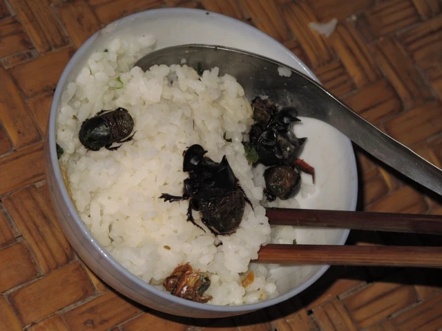 Passfahrten sind landschaftlich zwar wunderschön, jedoch in den Tropen während der Trockenzeit nicht gerade sonderlich angenehm. Mich beruhigte es sehr, dass auch Patrick zu kämpfen hatte. Bei den Zwischenstops im Schatten unterhielt uns Leeroy meistens mit seinen Geschichten, während wir versuchten uns ein wenig zu erholen. Da fragt man sich manchmal schon wer jetzt die halbe Portion ist! Vermutlich liegt das am Alter. Man wird schliesslich nicht jünger. Nicht nur landschaftlich und kulturell hat Nordvietnam einiges zu bieten. Besonders auf kulinarischer Ebene gab es einige Spezialitäten. Hundefleisch ist beispielsweise eine Delikatesse hier. Man kriegt aber auch allerlei Insekten auf den Teller.