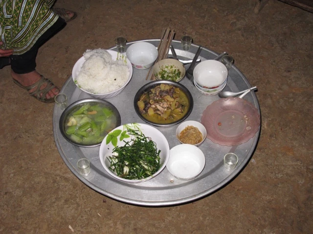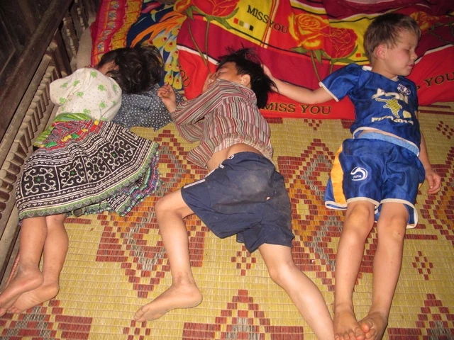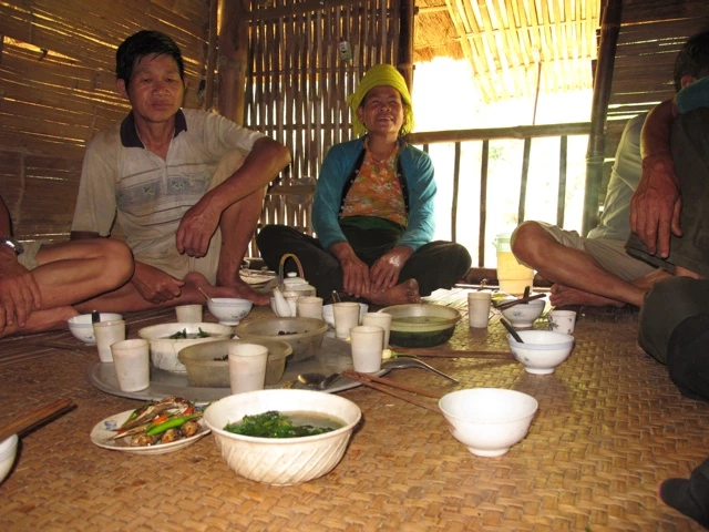 Die Religion der Mường enthält chinesische, vietnamesische und animistische Elemente. Wir wurden sogar auf einen Besuch beim Bürgermeister des Dorfes eingeladen. Spät am Abend erreichten wir dann unser Nachtlager. Der Gastgeber schlachtete extra für uns ein Huhn. Leeroy schlief schon vor dem Abendessen ein. Es wurde viel gelacht und getrunken beim Essen. Nach einem kurzen Film fielen wir ins Bett.