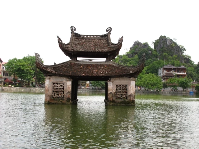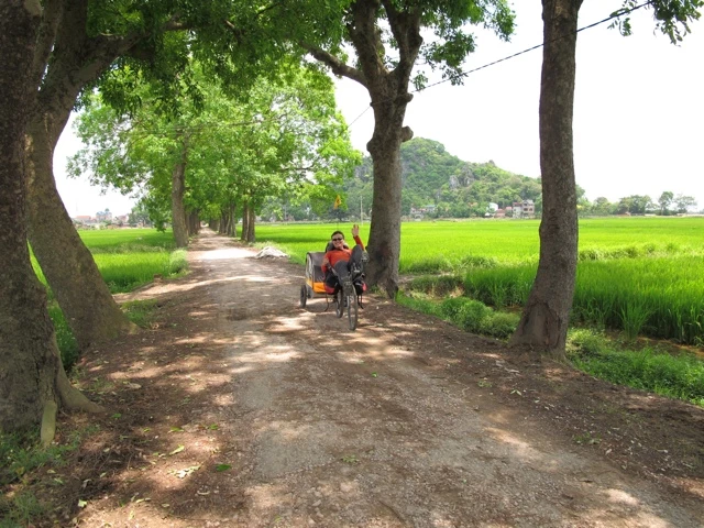 Gegen Mittag hielten wir an einer Pagode, die von einem See geschützt wird. Sandra und Patrick waren bereits schon einmal mit ihren Kids zu den Osterfeierlichkeiten hier. Im See steht ein Wasser Puppentheater. Im Ethnologischen Museum in Hanoi konnten wir das Theater einmal bestaunen. Die Puppen sind wunderschön. Nur ist die laute und schrille Musik beinahe unerträglich. Nachdem unser Kalorienvorrat aufgefüllt war ging es weiter durch kleine Reisfeld Pfade bis uns irgendwann die Hitze zuviel wurde und wir in einen Park zur Siesta flüchteten.