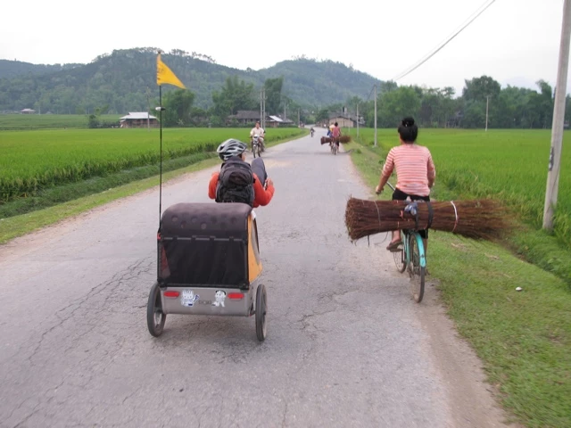 Die Nächte verbrachten wir jeweils in den Nha Nghi’s (Gästehäuser). Son Tay lag am ersten Tag bereits hinter uns. Die nächsten zweieinhalb Tage führte die Hauptroute G32 langsam immer mehr in die Berge. Vorbei an unzähligen Kaffe- und Reisfeldern, über die ersten Pässe und natürlich viel Sonnenschein. Bei einigen Steigungen musste Leeroy aussteigen und seinen Papi zu Fuss begleiten. Auf einem Markt stellten wir Leeroy auf die Waage und siehe da: die halbe Portion wiegt bereits 20 Kilogramm! Patrick meinte anschliessend, dass dies definitiv die letzte Fahrt für Leeroy im Anhänger war.