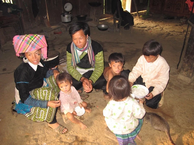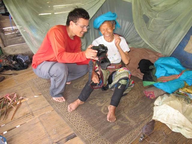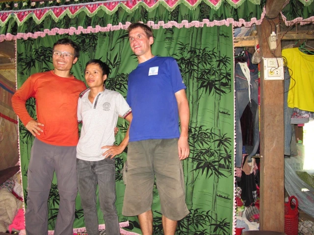 Die Käfer schmeckten ziemlich knusprig. Grosse Freude hatten die Leute jeweils, wenn wir sie fotografierten. Unser Gastgeber lud uns ein, die Nacht im Bergdorf bei den Mường zu verbringen. Das Angebot konnten wir natürlich nicht ablehnen. So liefen wir von einem Haus zum nächsten und arbeiteten uns langsam den Berg hoch. Dabei gab es immer wieder etwas zu trinken (Grüntee oder Gemüsewasser) und ab und zu Essen. Vermutlich haben noch nicht viele Ausländer diese Gegend besucht. Die Leute waren vor allem von unserer Grösse beeindruckt. Wir überragten sie meistens mindestens um einen Kopf.