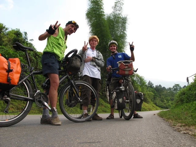 Nach dem Frühstück musste ich mich leider von allen verabschieden, da mein Vietnam Visa langsam abläuft und ich die Grenze unbedingt noch vorher erreichen möchte. Patrick blieb mit Leeroy im Bergdorf zurück. Wehmütig und noch nicht ganz nüchtern machte ich mich auf den Abstieg. Dankä vielmal Patrick und Leeroy. Isch super gsii mit oi! Unten im Dorf belud ich meinen Kurd, verabschiedete mich vom Rest der Familie und fuhr wieder zurück auf die G32 Richtung Sapa. Nach dem ersten Pass, als ich schon kurz vor einem Hitzekollaps stand, kamen mir zwei französische Velofahrer entgegen. Sie arbeiten in Kunming und haben sich ein paar Wochen frei genommen um von Kunming nach Hanoi zu radeln.